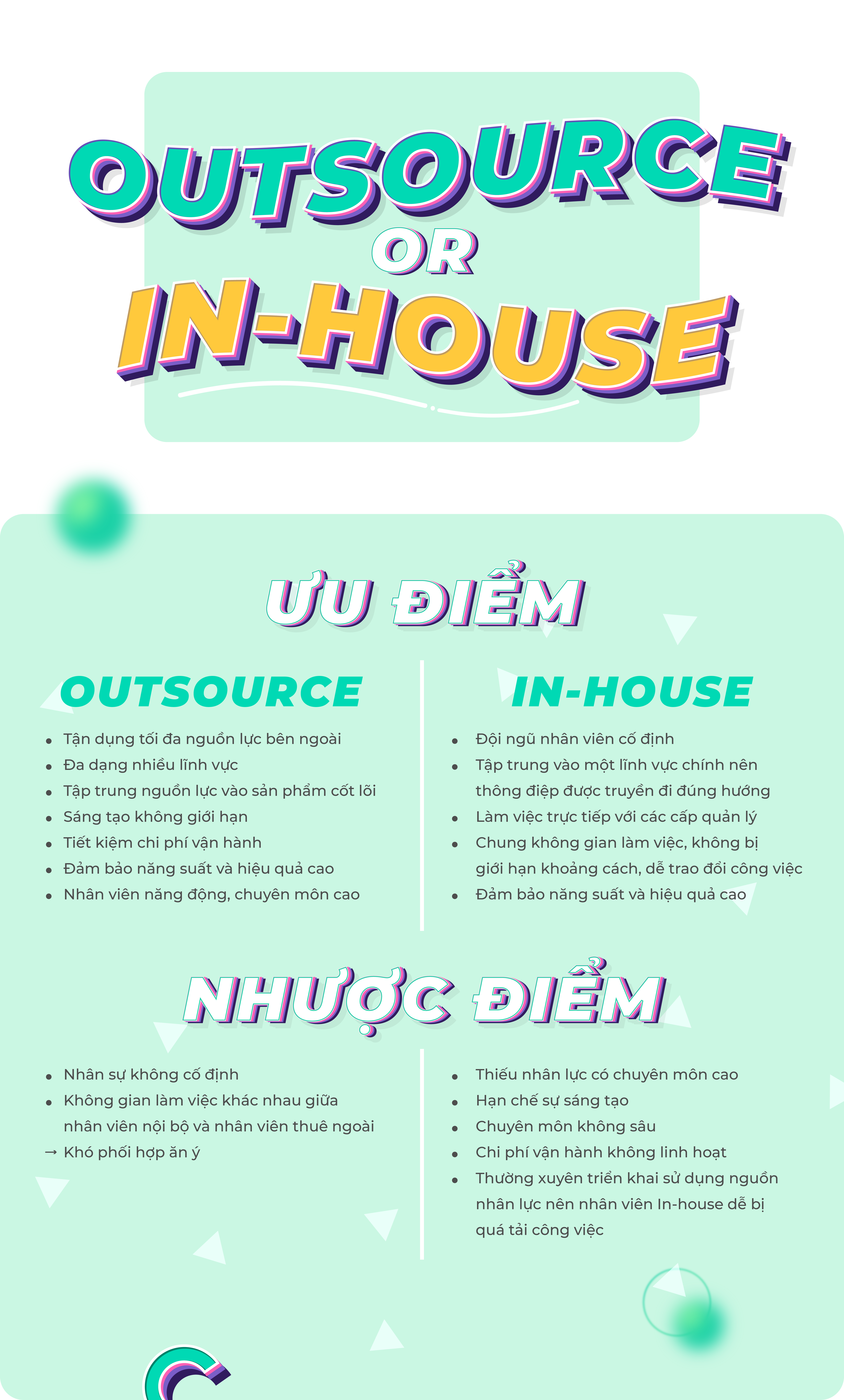 Phương án xây dựng đội ngũ nhân sự In-house hay Outsource đều tồn tại những ưu và nhược điểm nhất định. Các doanh nghiệp mới thành lập hoặc có quy mô nhỏ, chạy các campain ngắn cần các agency có chuyên môn cao, hay đứng trước hàng loạt khó khăn về kinh tế thì việc lựa chọn Outsource sẽ tiết kiệm chi phí đầu tư cho SME.